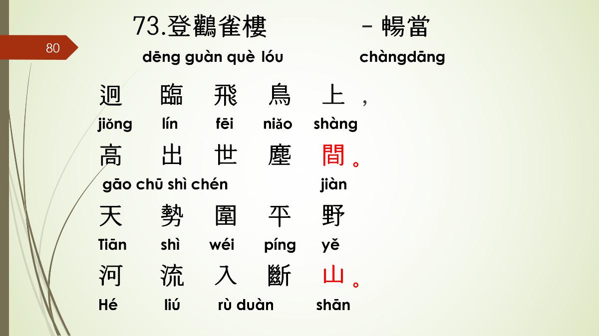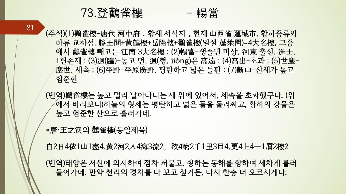 작품과 문학적 특징 暢當의 시는 주로 자연과 인간의 관계를 다루며, 그의 대표작 중 하나인 **《登鹳雀楼》(등관작루)**는 특히 유명합니다. 이 시에서 그는 높은 곳에서 세상을 바라보며 느끼는 감정을 표현하고 있습니다. 시의 한 구절에서는 "높은 곳에서 티끌 세상을 바라보네"라는 구절이 인상적이며, 이는 그의 시적 상상력과 깊은 통찰을 보여줍니다. 暢當은 또한 여러 작품을 남겼으며, 그 중에는 《春日过奉诚园》, 《宿报恩寺精舍》, 《奉送杜中丞赴洪州》 등이 있습니다. 그의 시는 대개 간결하면서도 깊은 감정을 담고 있으며, 자연의 아름다움과 인간의 삶을 조화롭게 연결 짓는 특징이 있습니다.