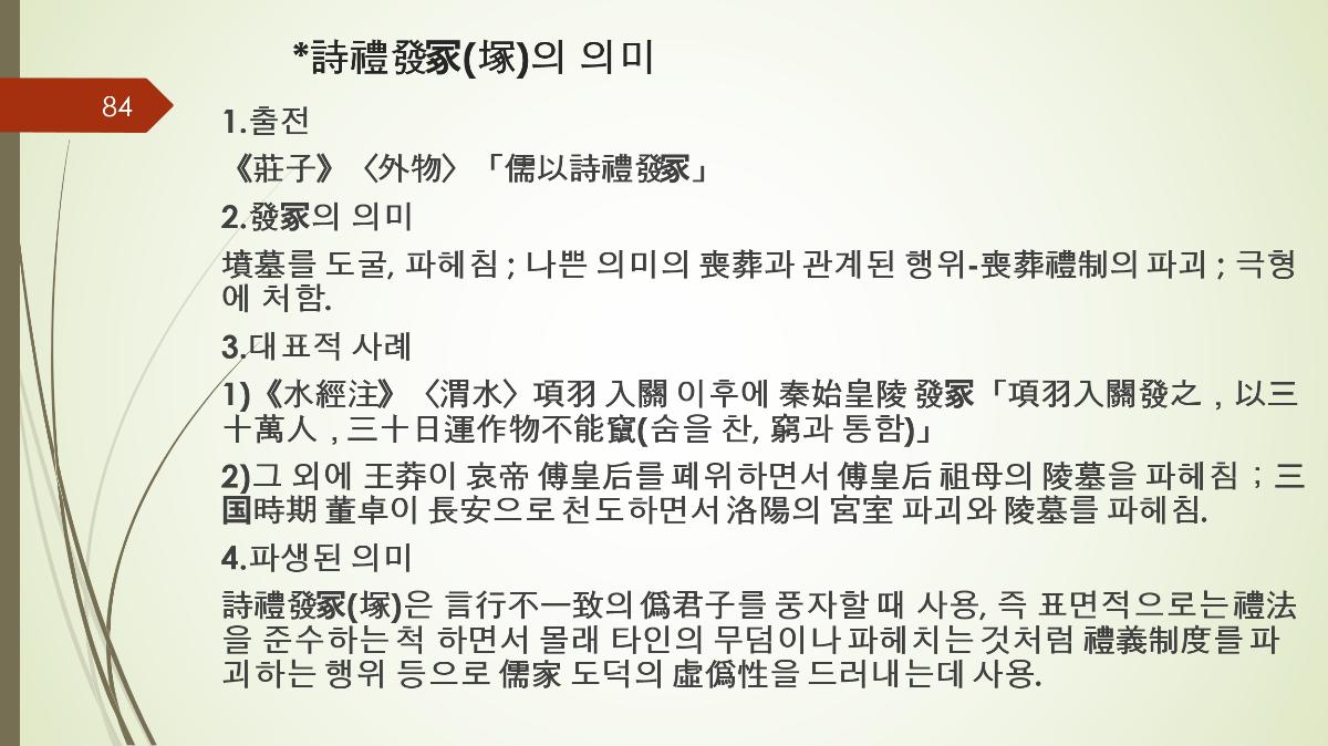 (6) 禮經(《周禮》,《儀禮》,《禮記》), 《莊子》〈外物〉「儒以詩禮發冢」 유가(儒家)는 시와 예로써 예법을 준수하는 척 하며 몰래 타인의 무덤을 발굴하여 예의제도를 파괴한다.'(언행 불일치)