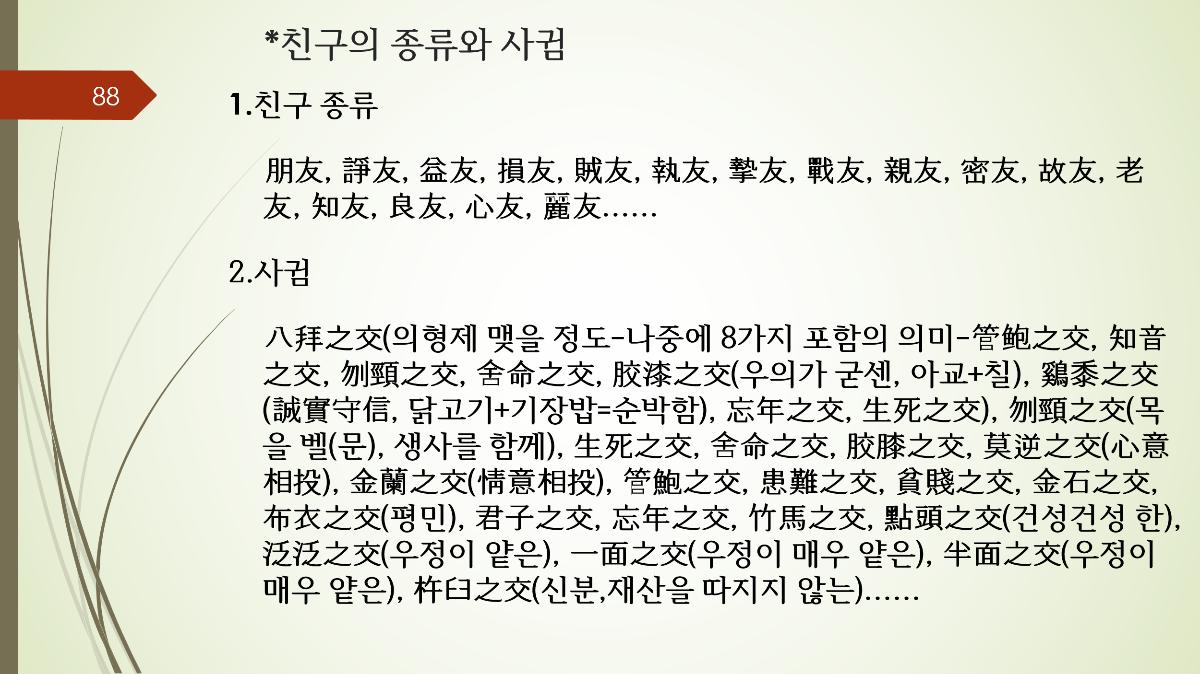 * 우정의 유대 관계(友誼의 끈): 八拜之交(팔배지교) 1. 관포之交(管鮑之交)는 관중과 포숙아의 우정으로, 서로를 완전히 이해하고 무조건 지지하는 관계를 뜻한다. 관중이 이익을 더 많이 가져가도 포숙아는 그의 사정을 이해했고, 나중에 정적이었던 관중을 재상으로 추천할 정도로 이타적인 우정을 보여주었다. 2. 知音之交(지음지교)는 백아와 종자기의 우정으로, 영혼이 통하는 친구를 가리킨다. 백아가 거문고를 탈 때 종자기만이 그 마음을 완전히 이해했고, 종자기가 죽자 백아는 거문고를 부수며 다시는 연주하지 않겠다고 맹세했다. 3. 刎頸之交(문경지교)는 서로를 위해 목숨을 바칠 수 있는 우정으로, 조나라의 염파와 인상여의 이야기에서 유래했다. 4. 膠漆之交(교칠지교)는 아교와 옻칠처럼 끈끈한 우정을 뜻한다. 떨어질 수 없는 견고한 관계를 의미한다. 5. 雞黍之交(계서지교)는 약속을 반드시 지키는 신의 있는 우정으로, 범식과 장소가 2년 후 만날 약속을 정확히 지킨 이야기에서 비롯되었다. 6. 舍命之交 (사명지교): 목숨을 걸고 지키는 친구. 7. 忘年之交 (망년지교): 나이를 초월한 우정. 8. 生死之交 (생사지교): 생과 사를 함께 하는 친구