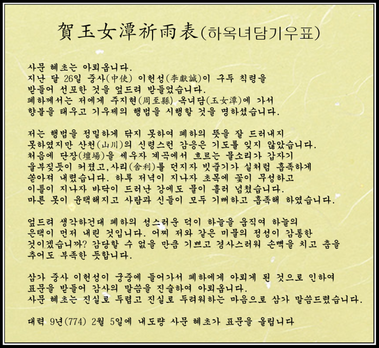 774년 2월 혜초는 내도량(內道場, 궁중 원찰)의 사문(沙門,출가하여 도를 구하는 사람)으로 활동하면서 성지인 옥녀담(玉女潭)에서 기우제를 주관하고 「하옥녀담기우표(賀玉女潭祇雨表)」를 지었다.