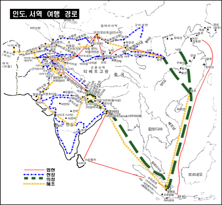 ※ 제가 만약에 지금 인도에 간다면 어떻게 준비했을까? 다녀온 여행기를 파악하여 누구랑 갈지, 어떻게 갈지, 여행 기간 및 일정, 교통편, 숙박, 식사(맛집), 언어나 통역, 여행경비 추정과 조달, 방문국 정보, 준비물 등 여행 계획을 세울 것이다. 마찬가지로 혜초 스님도 이미 다녀온 고승들의 여행기를 찾아 일정과 경유지, 의식주 해결 방법, 교통, 통역, 위험 대처법, 비용 등을 파악하고 계획을 세웠을 것이다.