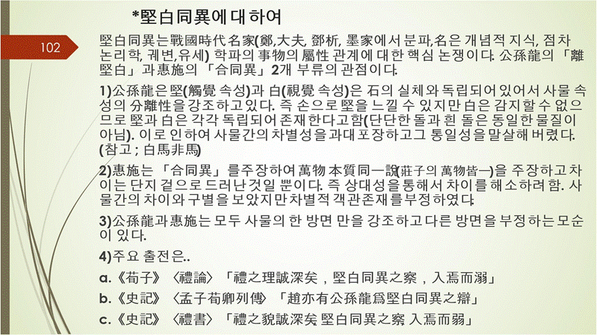 * 중국 명가철학 1. 명가철학의 탄생과 시대적 배경 중국 고대 철학사에서 명가(名家)는 매우 독특한 위치를 차지한다. 춘추전국시대라는 격동의 시기, 제자 백가가 백가쟁명(百家爭鳴)하며 각자의 사상을 펼치던 그 시절에 명가는 언어와 논리, 개념과 실재의 관계를 탐구하는 철학적 학파로 등장했다. 이들은 실천적 정치철학이나 도덕론에 집중했던 유가나 법가와는 달리, 순수하게 논리적이고 인식론적인 문제들을 탐구했다는 점에서 중국 철학사에서 예외적인 존재였다. 명가라는 명칭은 한나라의 사마담이 『사기』의 「논육가요지(論六家要旨)」에서 처음 사용했다. 그 이전에 『장자』의 「천하편」에서는 이들을 “변자(辯者)”, 즉 논변을 일삼는 사람들이라고 불렀다. 이러한 호칭들은 명가 철학자들이 일상적 상식을 뛰어넘는 역설적 명제들을 제시하고, 그것을 논리적으로 논증하려 했던 그들의 독특한 철학적 방법론을 잘 보여준다. 전국시대는 봉건 질서가 무너지고 새로운 사회 질서를 모색하던 시기였다. 이러한 혼란 속에서 언어와 명칭, 그리고 그것이 지칭하는 실재 사이의 관계를 명확히 하는 것, 즉 “정명(正名)“의 문제는 단순한 철학적 유희가 아니라 사회 질서를 재건하기 위한 근본적 과제였다. 공자도 “명불정즉언불순(名不正則言不順)”, 즉 명칭이 바르지 않으면 말이 순조롭지 않다고 강조했지만, 명가는 이 문제를 훨씬 더 정교하고 논리적인 수준에서 다루었다.