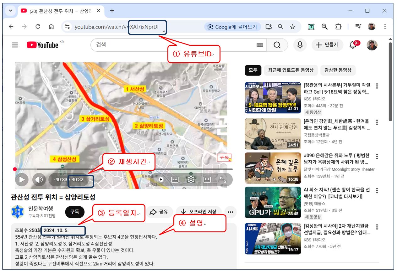 1 단계. 유튜브 플랫폼에서 지식지도에 연관성이 높은 등록 대상 영상을 검색합니다. 2 단계. 등록 양식에 필요한 핵심 정보를 정확히 확인하고 복사합니다. 필수 정보 ① 유튜브 ID 영상 URL(https://youtube.com/watch?v=...)에서 v= 다음에 오는 고유 문자열입니다. 필수적으로 복사해야 합니다. ② 재생시간 영상의 총 길이(시:분:초 형식)를 확인합니다. ③ 등록일자 영상이 유튜브에 최초 업로드된 날짜를 확인합니다. ④ 설명 원본 영상의 설명 내용 중 핵심 요약(3줄 내외)을 준비합니다. 원본 설명이 없거나 부족할 경우, 영상 내용을 기반으로 간단히 요약하여 작성합니다.
