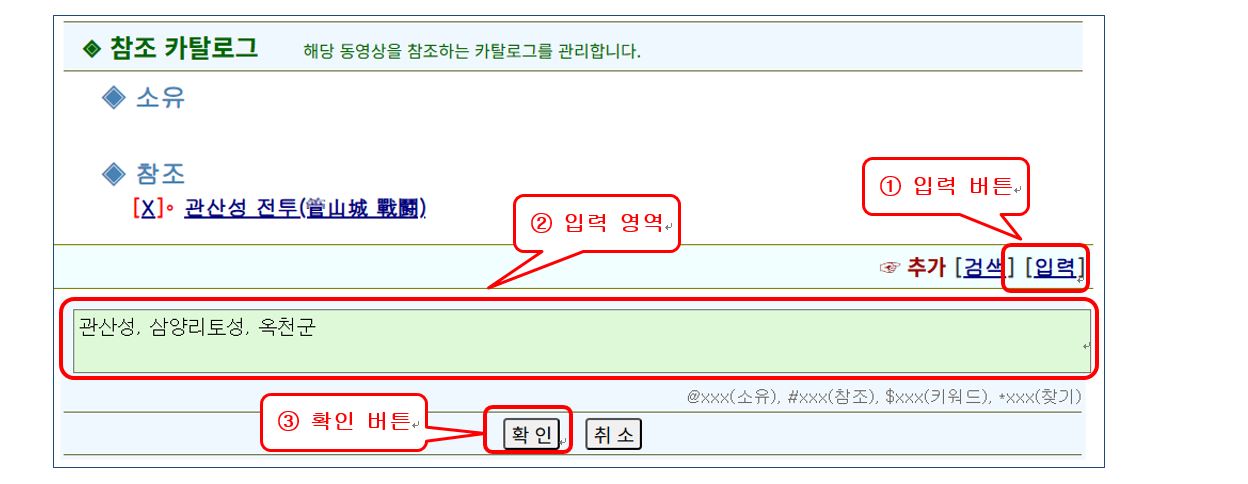 1. 키워드 기반 연결 - 등록 화면 하단의 [참조 카탈로그 등록] 영역에서 ① "입력" 버튼을 클릭합니다. - ② 입력 영역에 참조할 지식지도의 핵심 키워드들을 입력한 후 - ③ “확인” 버튼을 눌러 참조 카탈로그 목록에 추가합니다.