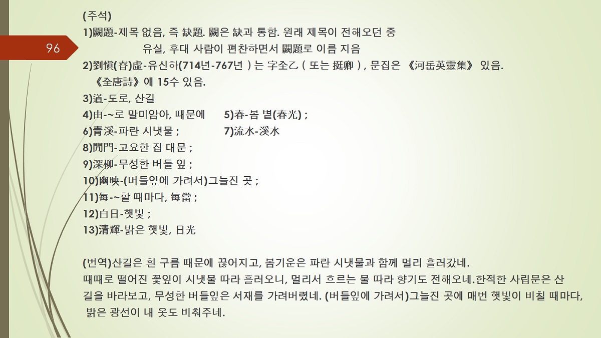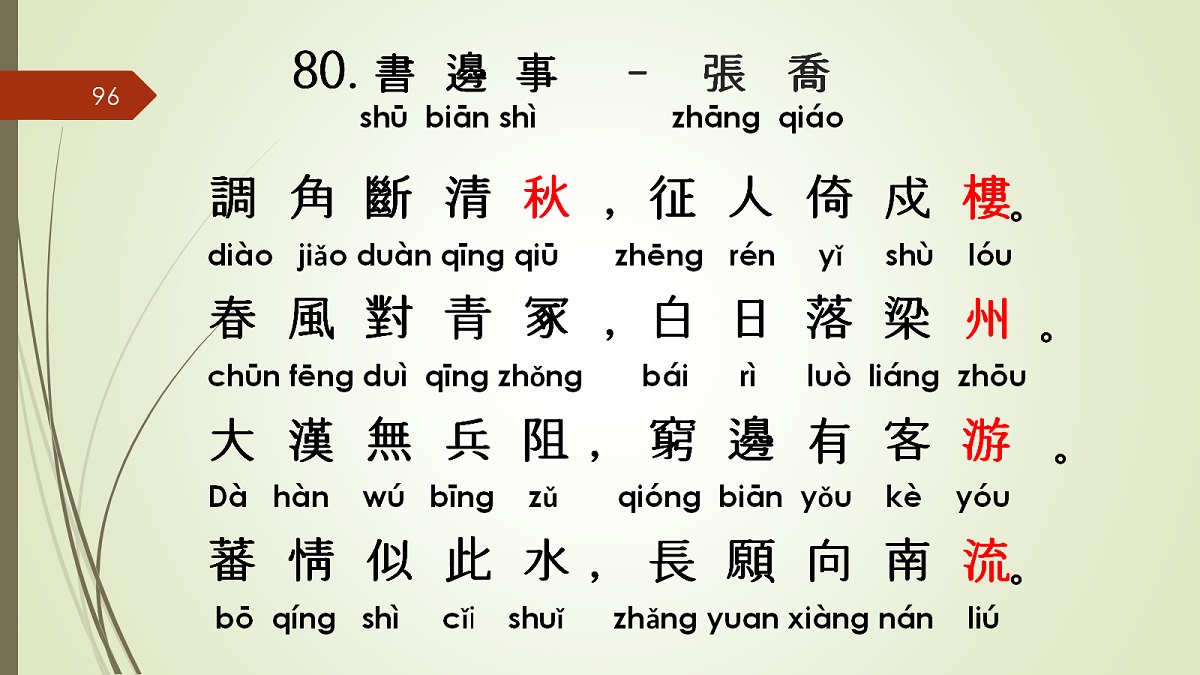 1) 당시제목 : 서변사 2) 작자 : 장교(張喬) 生沒年 : 미상 (당나라 말기 활동) - 활동 시기 : 당 의종(懿宗) 함통(咸通) 연간(약 860년~874년) 무렵 진사(進士) 시험에 급제한 것으로 추정됩니다. - 특징 : 당나라 말기의 격변기, 특히 황소의 난을 피해 구화산(九華山)에 은거하며 생을 마쳤습니다. 허당(許棠), 유탄지(喩坦之) 등과 함께 함통 십철(咸通十哲)로 불리며 문장력을 인정받았습니다. 구화사준(九華四俊) 중 한 명으로도 불립니다.