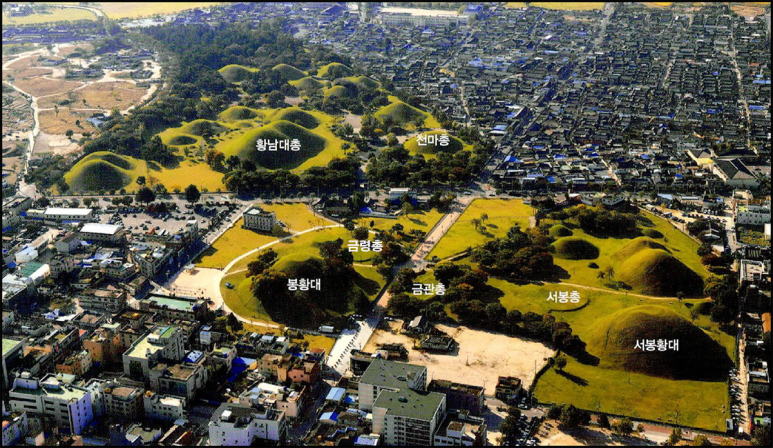 2. 무덤 이름 유래 ⓐ 금관총은 금관(金冠)이 출토된 무덤이라는 뜻으로, 1921년 경주 노서동에서 금관이 처음 발견된 데서 유래되었습니다. ⓑ 금령총(金鈴塚)은 1924년 금관보다 먼저 발견된 허리춤의 금방울(鈴) 때문에 지어졌습니다. ⓒ 서봉총은 일제강점기 1926년 스웨덴의 황태자가 발굴에 참여하여 봉황 장식의 금관과 목걸이, 귀걸이 등의 장신구가 출토되었다. 이를 기념하고자 스웨덴의 한자이름인 서전의 ‘서(瑞)’ 자와 봉황의 ‘봉(鳳)’ 자를 따서 서봉총이라 하였답니다. ⓓ 천마총은 1973년 무덤에서 출토된 자작나무 껍질에 그려진 하늘을 나는 말(天馬) 그림이 그려진 말다래(장니, 障泥)에서 유래되었습니다. ⓔ 황남대총은 두 개의 무덤이 남북으로 맞붙어 있는 가장 큰 무덤, 황남동에서 가장 큰 무덤(남북 길이 120m이며 동서 지름 80m, 높이 약 22m)이라는 뜻에서 붙여진 이름입니다.