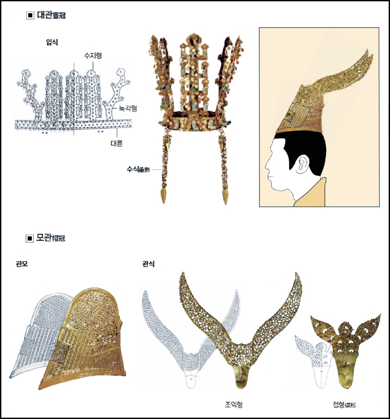 ◆ 관(冠)의 명칭 • 신라의 관은 재질에 따라 금관, 금동관, 은관, 동관으로 나뉘며 관테(대륜.臺輪)의 유무에 따라 대관(臺冠)과 모관(帽冠)으로 구분합니다. • 대관은 관의 아래쪽에 관테가 둥글게 돌아가고 그 위에 수지형(樹枝形)과 녹각형(鹿角形)의 입식(立飾)이 있는 형태입니다. • 모관은 관모(冠帽)와 관식(冠飾)으로 구성된다. 모(帽)는 백화 수피제(白樺樹皮製, 자작나무 껍질)가 가장 많고 금, 금동, 은제품도 일부 있고, 관모에 장착되는 관식은 나비형(蝶形)보다 조익형(鳥翼形)이 많습니다.