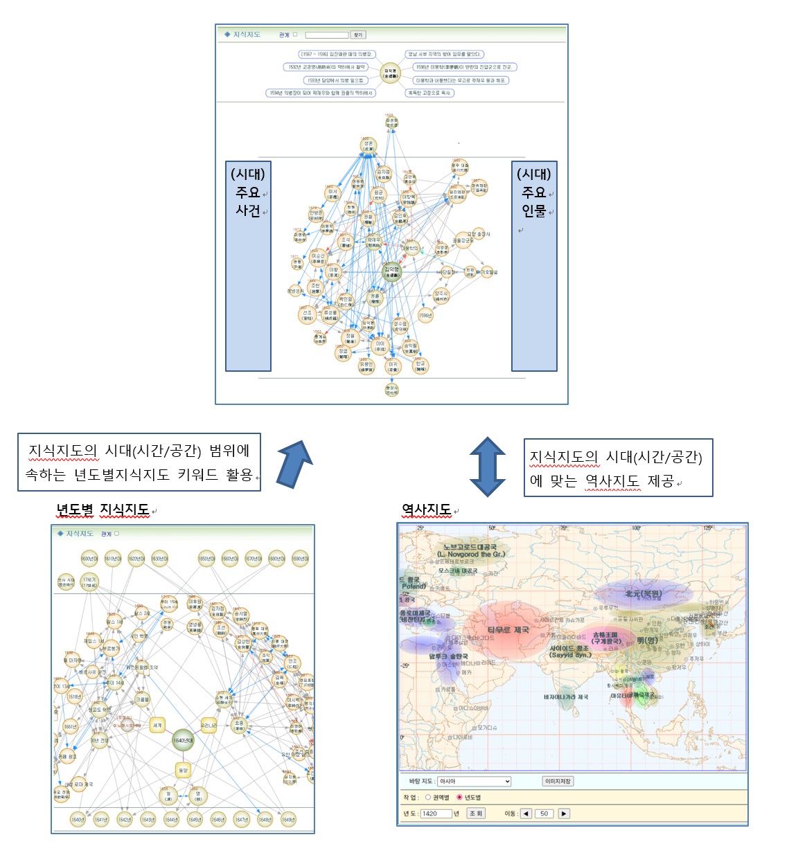 • 지식지도: 특정 키워드를 중심으로 확장되는 네트워크 시각화 • 역사지도: 특정 시기·지역의 역사적 상황을 지도 기반으로 제공 • 관계지도: 지식카탈로그의 항목간의 영향 관계, 계층 구조 제공 • 참조자료 연동 보기: 관련 원문·영상·문서·기관자료를 한 화면에서 확인