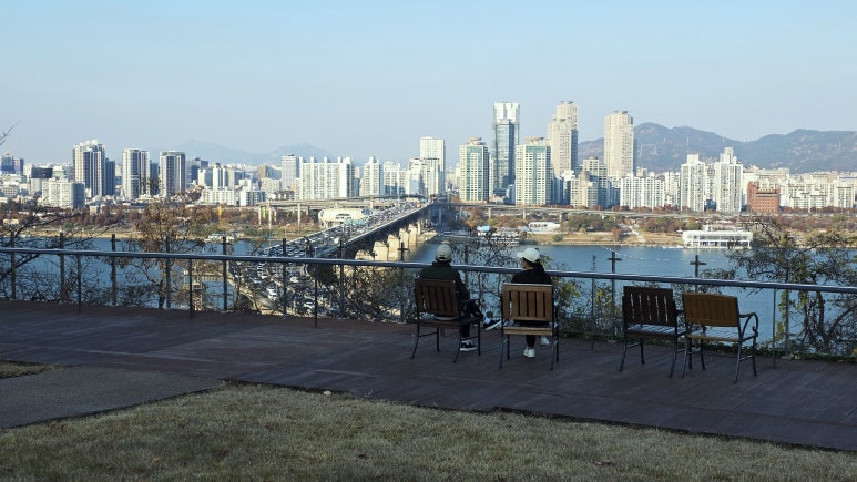▼ 한강을 볼 수 있는 안전유리 펜스와 공원 의자들