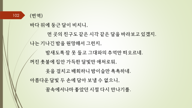 1. 당시제목 : 망월회원 2. 작자 : 장구령(張九齡)( 678~740) 당나라의 시인 장구령은 당나라 현종(玄宗) 시대의 마지막 명재상 (名宰相)으로 불리는 정치가이자, 당나라 시의 전성기인 성당(盛唐) 시기를 대표하는 시인 중 한 명입니다. 그는 뛰어난 문학적 재능뿐만 아니라, 강직한 성품과 선견지명을 가진 인물로 역사에 기록되어 있습니다.