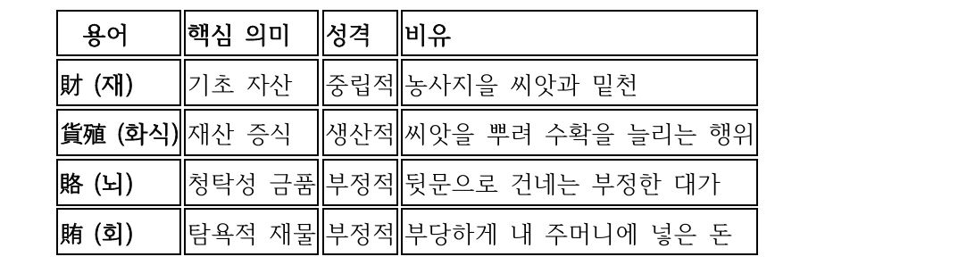 * 재물이나 돈을 뜻하는 재(財), 화식(貨殖), 뇌(賂), 회(賄)의 차이 1. 財 (재물 재) : 가치 있는 바탕 • 의미: 기본적이고 바탕이 되는 자산. • 풀이: 貝(조개 패 = 돈) + 才(바탕 재)가 합쳐진 글자입니다. • 특징: 어떤 일을 하기 위한 '재료'가 되는 자금이나 물자를 뜻합니다. '인재(人才)'라는 말에서 보듯, 사람에게 잠재된 능력이나 바탕이 되는 기초적인 부를 의미하는 긍정적·중립적 표현입니다.
