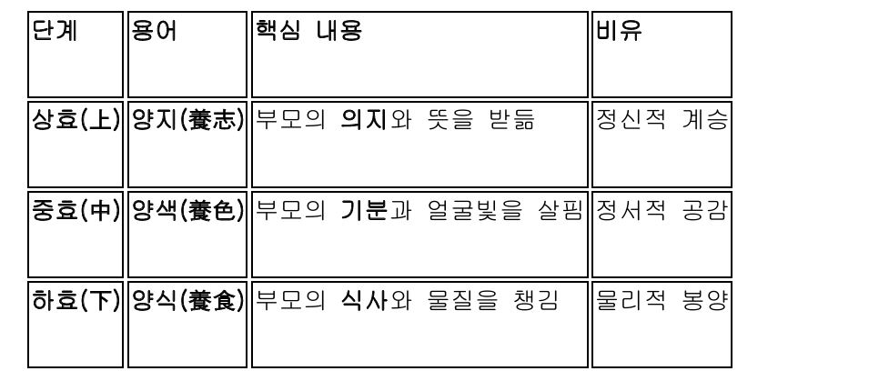 2. 중효(中) - 양색(養色) o 핵심 내용: 부모의 기분과 얼굴빛을 살피는 단계입니다. 자식은 부모의 감정 상태를 이해하고, 그에 맞춰 행동해야 합니다. 이는 부모의 기분을 존중하고, 그들이 편안함을 느낄 수 있도록 배려하는 것을 포함합니다. o 비유: 정서적 공감으로 비유할 수 있습니다. 자식이 부모의 감정을 잘 이해하고 그에 따라 행동하는 것은 서로의 정서적 유대를 강화하는 중요한 요소입니다.