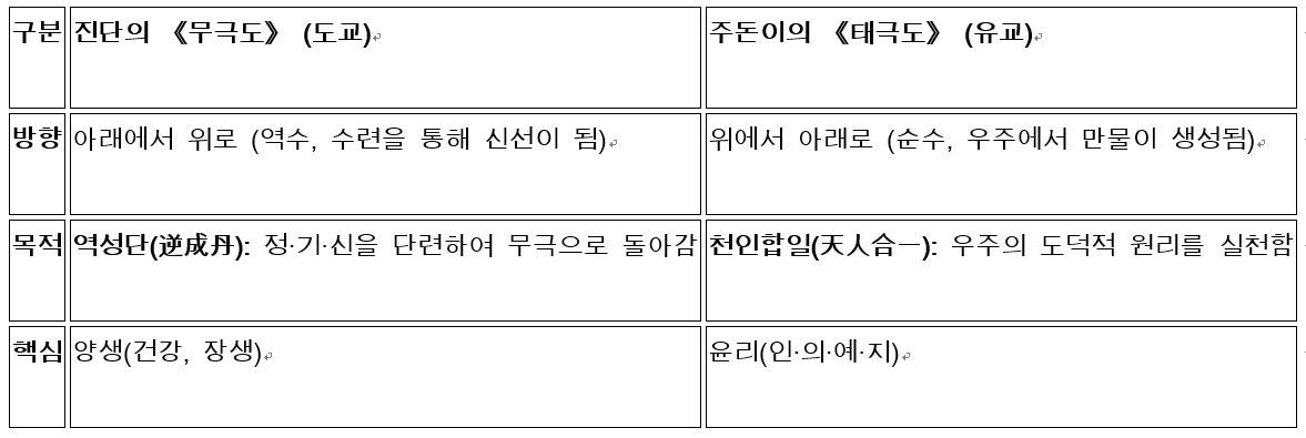 중국 송나라 시대의 유학자 주돈이(周敦頤, 1017~1073)는 도교적 색채가 강했던 진단(陳摶)의 《무극도(無極圖)》를 유교적으로 재해석하여 태극도설(太極圖說)》을 저술했습니다. 이는 훗날 주희(주자)에 의해 성리학의 핵심 우주론으로 정립됩니다.