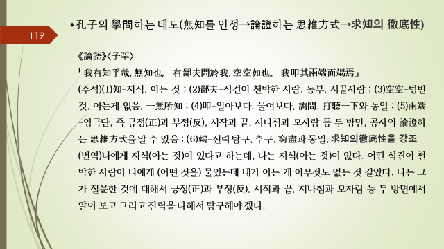 * 공자는 스스로에게 “내가 과연 안다고 할 만한 것이 있는가”라고 묻고, 곧 바로 “無知也”, 곧 자신은 아는 것이 없다고 단언한다. 여기서 知는 단순한 정보가 아니라 확실한 지식과 통찰을 뜻하며, 無知는 겸손의 수사가 아니라 학문적 출발점으로 서의 자기 인식이다. 이어 공자는 “有鄙夫問於我”라고 말한다. 여기서 鄙夫란 식견이 천박한 사람, 혹은 농부나 시골 사람처럼 학문적으로 훈련되지 않은 사람을 가리킨다. 그러나 공자는 그 질문을 가볍게 여기지 않는다. 오히려 그가 묻는 순간, 자신 역시 “空空如也”, 즉 머릿속이 텅 빈 것처럼 느껴진다고 말한다. 이는 질문 앞에서 선입견이나 이미 알고 있다는 태도를 내려놓고, 문제 자체와 정면으로 마주하려는 자세를 보여준다. 그 다음 공자는 자신의 사고 과정을 이렇게 설명한다. “我叩其兩端而竭焉.” 여기서 叩는 두드리다, 캐묻다, 따져 “묻다”의 뜻으로, 단순한 질문이 아니라 반복적이고 집요한 탐문을 의미한다. 兩端이란 사물의 양극, 곧 正과 反, 始와 終, 過와 不及처럼 서로 대립하는 두 측면을 말한다. 공자는 질문 받은 사안을 어느 한쪽으로 단정하지 않고, 양쪽 끝을 모두 두드리듯 살펴본다. 그리고 그렇게 가능한 모든 방향에서 탐구하여 竭, 곧 힘이 다할 때까지 사유한다고 말한다. 이 구절은 공자의 학문 태도가 단순한 지식의 축적이 아니라, 논증하는 사고 방식, 곧 思維方法에 있음을 보여준다. 그는 모른다는 사실을 인정하고, 질문을 통해 사유를 촉발하며, 사물의 양면을 끝까지 검토하는 방식을 통해 지식에 접근한다. 이는 곧 求知의 徹底性, 다시 말해 앎을 구하는 데 있어 타협하지 않는 태도이다.