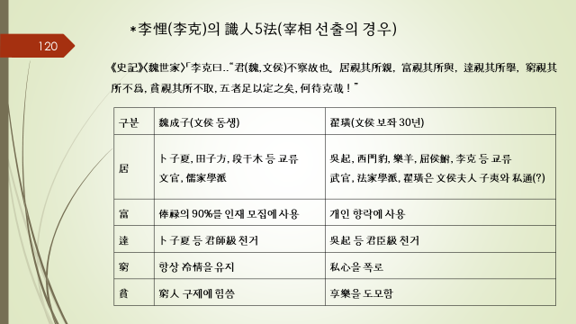 * 【識人法5】- 李悝(BC.445-BC.395), 달리 李克,戰國 政治家、魏国丞相 《史記》〈魏世家〉「李克曰..“君不察故也。居視其所親, 富視其所與, 達視其所擧, 窮視其所不爲, 貧視其所不取, 五者足以定之矣, 何待克哉!” 文侯曰..“先生就舍, 寡人之相定矣”」에 보인다. 즉 戰國時代 초기 魏나라의 승상 李悝(克)의 「識人五法」의 일부분이다. 魏나라 文侯가 魏成子와 翟璜 두 사람 중에서 승상을 선발하려고 하였다. 그러나 두 사람 모두 재주가 뛰어나서 누구를 선택할지 몰랐다. 그래서 李悝에게 선발의 기준에 대해서 문의하였고, 李悝는 5가지 인재를 구별하는 표준(識人5法)을 제시하였다. 魏나라 文侯는 이에 근거하여 최종적으로 魏成子를 승상으로 선발하였다. 「識人五法」을 요약하면 第一, 居視其所親(평상시 賢人과 함께 하는지를 살핌) ; 第二, 達視其所擧(고위직에 있을 때 어떻게 부하를 선발하는지를 살핌) ; 第三, 富視其所與(부유할 때 가난한 사람을 구제하는지를 살핌) ; 第四,窮時其所不爲(곤경에 처했을 때 지조를 잃지 않고 구차한 일을 하지 않음을 살핌) ; 第五, 貧視其所不取(가난할 때 의롭지 않은 재물을 받지 않음을 살핌) 등이다.