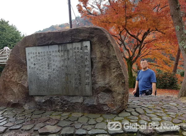 필자는 2018년 12월 4일 세계유산 天龍寺 사찰과 소켄지 정원, 대나무 숲(치쿠린)과 저우언라이(周恩來, 1898~1976) 총리 기념 시비를 구경하러 방문했다. 周恩來는 14살에 천진의 남개중학에 입학하고 졸업한 후, 1917년 일본 유학에 올라 도교에 머물며 대학에 진학하려고 하였으나 생각처럼 되지 않았다. 그러다 중국에서 5·4 운동이 벌어져 귀국을 결심했다. 周恩來는 21살 때인 1919년 4월 교토 외곽에 있는 아랴시야마의 풍광을 보기 위해 왔다가 〈雨中嵐山〉 시를 남겼다.