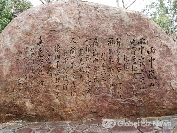 대나무 숲에 있는 周恩來 기념 시비를 보려고 대나무 숲길을 하염없이 걸어도 보이지 않아 포기하고 답답하고 껌껌한 대나무 숲을 떠나 강가에 있는 광장으로 내려왔다. 넓은 광장에 오니 가슴이 뻥하고 뚫린 것처럼 시원했다. 멀리 안내판이 있어 다가가니 필자가 찾던 시비 안내판이었다. 시간이 없어 그냥 가려다가 아쉬운 마음에 시비를 보고 싶어 언덕길을 다시 올라갔다. 약 10분 정도 올라가 대나무 숲 속에 우중람산(雨中嵐山) 시비를 드디어 만났다. 기념 시비 주변에는 아무런 표식이 없어 관광객들은 부지런하게 강가 쪽으로 그냥 내려갔다.