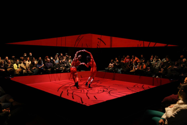 샤멜 피츠와 브루클린 기반 예술집단 트라이브(TRIBE)가 공동 창작하고 공연하는 신작 <터치 오브 레드(Touch of RED)>는 2015년 맥아더 펠로우 수상자인 미미 리엔이 디자인한 정교한 아레나에서 펼쳐지는 듀엣 댄스로 제목에서 알 수 있듯이, 붉은색은 작품의 중심 테마로, 도처에 존재하는 색채이자 피츠의 어린 시절 별명을 상징한다. 강렬한 진홍색 조명으로 가득 찬 공간은 피, 불, 분노, 욕망, 사랑 등 다양한 이미지를 떠올리게 하며 몰입형 퍼포먼스 경험을 볼 수 있다. 관객들은 한 줄로 극장에 입장하는데, 공간 중앙에 바닥에서 천장까지 거의 맞닿아 있는 벽으로 둘러싸인 붉은색 상자를 발견한다. 그 사이로 피츠와 그의 파트너 투쉬릭 프레데릭스가 관객들이 자리에 앉는 순간, 두 사람은 춤을 추기 시작해 마치 최면에 걸릴 듯 매혹적인 그루브 한 안무는 시반 야코보비츠의 앰비언트 EDM 음악에 맞춰 발을 구르고 박동하며 움직인다. 서로 가까이 모여 회전하는 그들의 움직임은 절제되어 있으면서도 섬세하고, 더할 나위 없이 친밀하다.