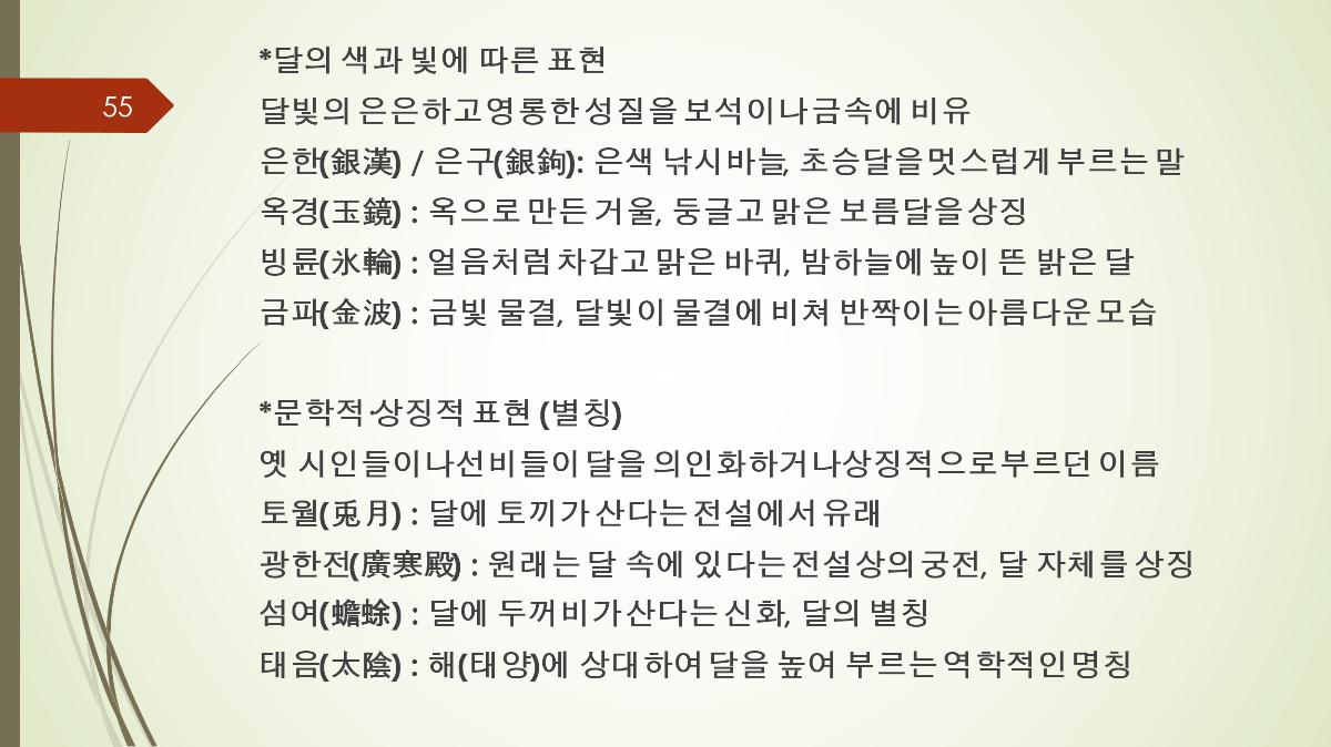 4. 宋(송): 詞(사) • 배경: 상업이 발달하고 도시의 유흥 문화가 번창하면서 나타났습니다. • 특징: 시(詩)가 엄격한 규칙에 맞춰 쓰는 것이라면, 사(詞)는 노래 가사입니다. 기존의 곡조(사패)에 맞춰 글자 수를 채워 넣었기 때문에 구절의 길이가 들쭉날쭉하여 '장단구(長短句)'라고도 불립니다. • 의미: 서정적이고 섬세하며, 남녀 간의 사랑이나 이별 등 세속적인 감정을 유려하게 표현했습니다. - 소식 〈염노교·적벽회고〉: 적벽의 장대한 풍광을 보며 과거 영웅들의 업적과 인생의 무상함을 호방한 필치로 노래했습니다. - 이청조 〈성성만(聲聲慢)〉: '심심하고 적막하다'는 감정을 섬세한 언어로 나열하며, 전란 속에 남편을 잃은 슬픔을 극도로 치밀하게 묘사했습니다. - 유영 〈우림령(雨霖鈴)〉: 연인과의 이별을 앞둔 애절한 감정을 세밀하게 묘사하여 당시 민중들 사이에서 가장 널리 불렸던 대표곡입니다.