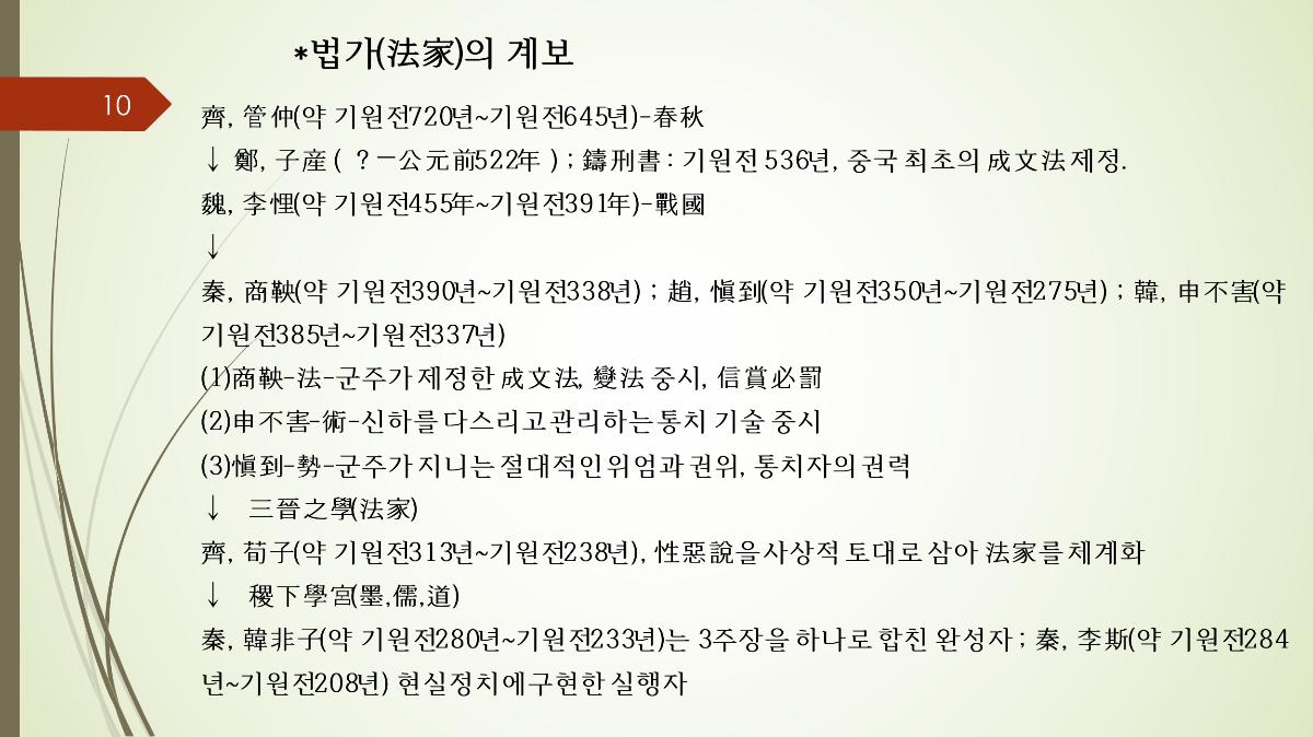 * 법가(法家) 법(法) - 성문법(成文法)을 제정하여 시행 (상과 벌로 통제) / 상앙(商鞅) 술(術) - 군주가 신하들을 통제하는 방법 / 신불해(申不害) 세(勢) - 군주의 강력한 권세로 통치 / 신도(愼到)