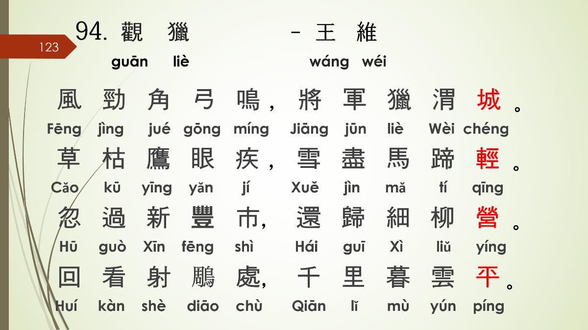 1. 당시제목: 관렵 2. 작자: 왕유(王維, 699~761)