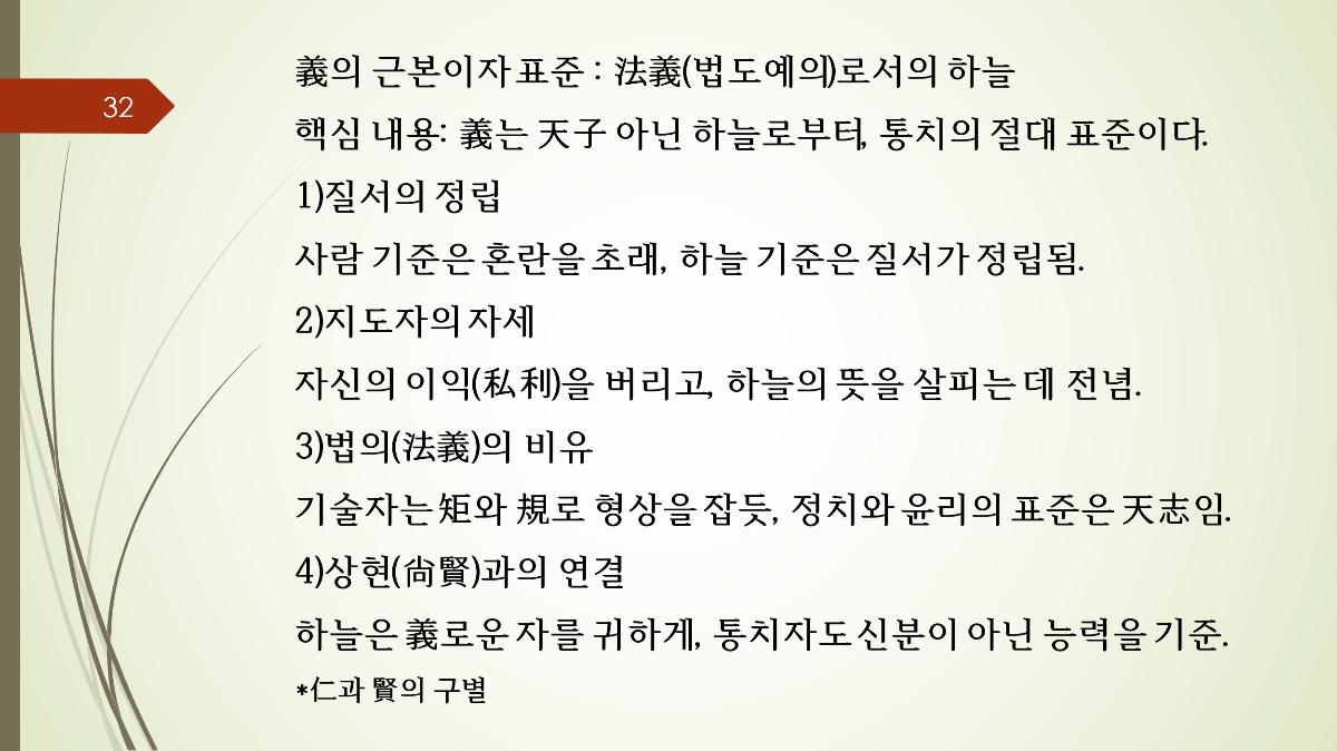 * 인(仁)과 현(賢)의 차이점 인(仁) 핵심 가치 : 사랑, 자애, 도덕적 본성 초점 : 내면의 수양과 마음가짐 지향점 : 보편적인 인간애의 실현 관계 : 모든 인간이 추구해야 할 근본