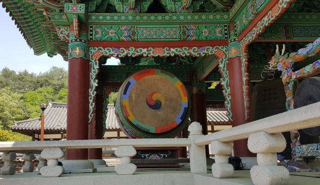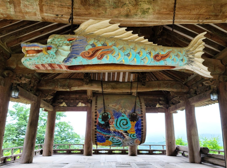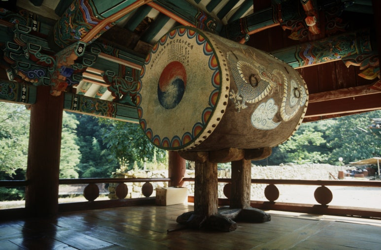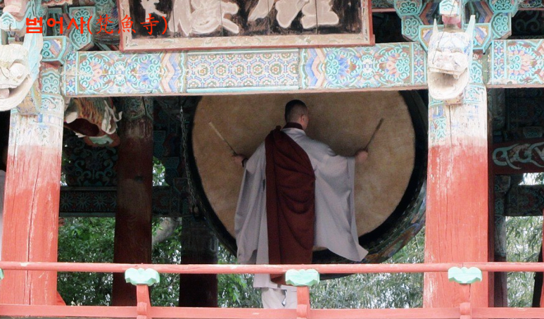 8. 사찰 법고들 ▼ 동래 범어사 법고 • 입지름 170cm, 폭 206cm • 법고를 칠 때 두 개의 북채로 마음 심(心) 자를 그리면서 두드림 • 북 가운데를 치면 "쿵쿵쿵", 원형의 북 가장자리는 "드르륵" 훑는 소리가 난다.