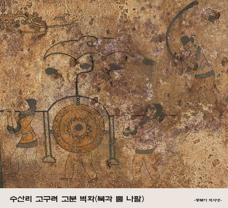 • 북한 남포시 수산리의 고구려 고분 벽화의 북 • 고분 동벽의 아랫부분에 태양 모양의 북과 뿔 나팔을 연주하는 악대와 악대를 따르는 여인들의 모습이 보인다.