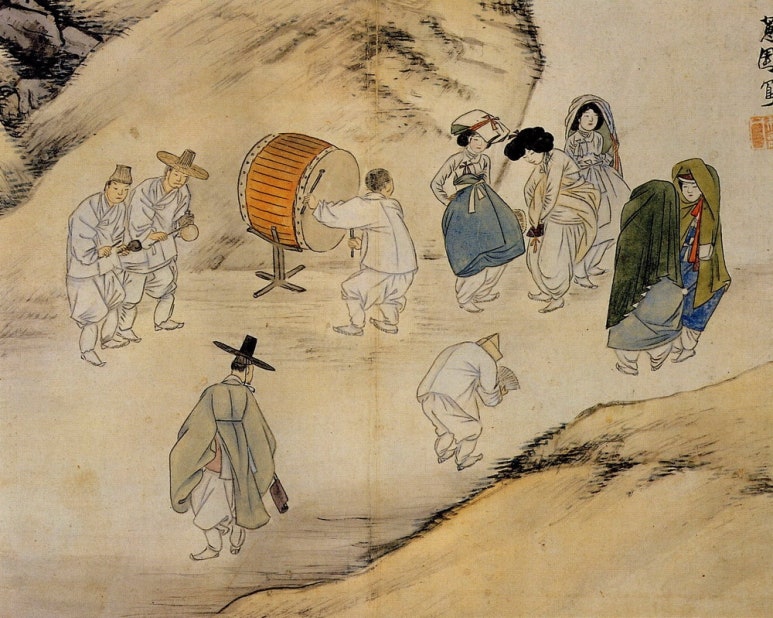 조선 후기 불교의 탄압으로 인해 사찰의 형편과 사정이 좋지 않을 때, 법고는 저잣거리로 나와 일반인들에게 탁발(托鉢)을 했던 상황을 그림을 통해 잘 알 수 있습니다. -신윤복의 노상탁발-