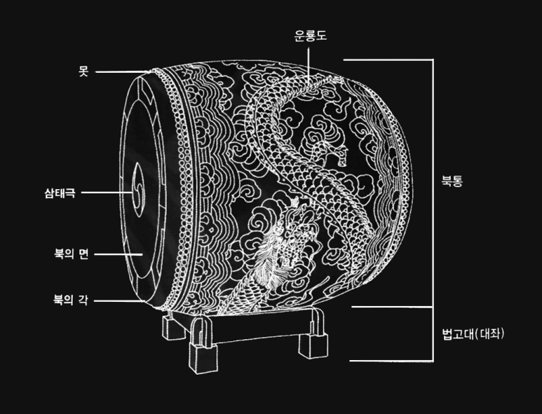 ① 북통 • 북통의 재료는 소나무로 여러 쪽을 둥글게 깎아 서로 짝을 맞춰 붙인다. • 그리고 대패를 이용해 북통의 면을 매끈하게 만든 다음 깨지거나 뒤틀리지 않도록 철 테두리를 두르거나 졸대로 보강한다. • 북통의 양쪽에 소가죽(牛皮) 면을 씌우고 나면, 북통에는 광목을 발라 말린 뒤 단청으로 구름 속에서 노니는 운용도(雲龍圖)을 그린다.