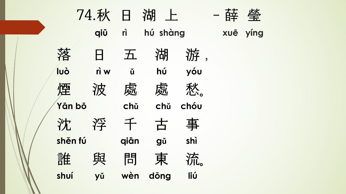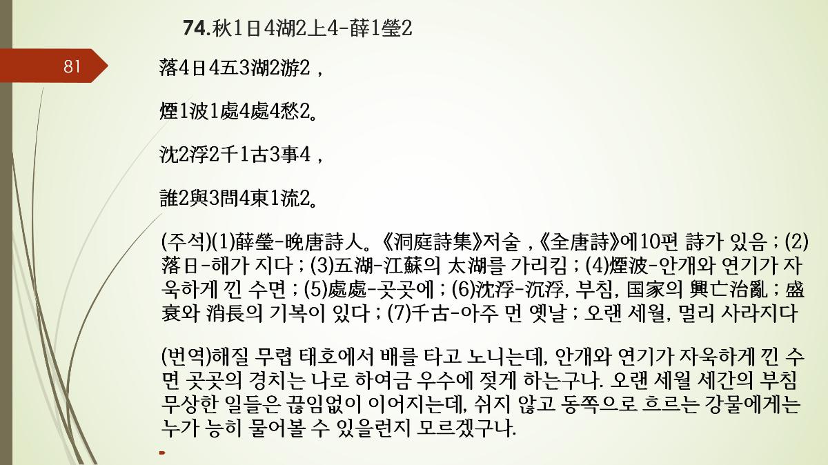 2) 작자: 설영(薛瑩) 설영은 중국 만당(晩唐) 시대의 시인으로, 당나라 문종(文宗) 시기에 활동했습니다. 그의 생애에 대한 구체적인 정보는 많이 남아 있지 않지만, 그는 주로 고독하고 은둔적인 삶을 주제로 한 시를 썼습니다. 설영의 시는 감정이 풍부하고, 역사적 맥락을 반영하는 경향이 있습니다.