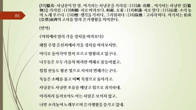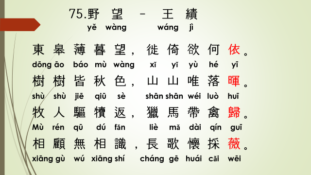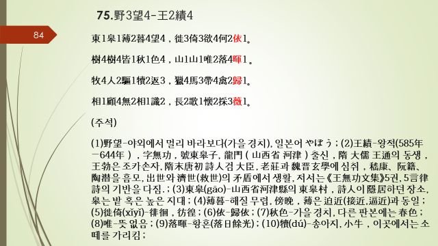 2) 작자 : 왕적(王績) 왕적(王績)은 수나라 말부터 당나라 초기까지 활동한 시인으로, 혼란했던 시대 상황 속에서 은둔과 음주를 즐기며 자신의 문학 세계를 구축한 인물입니다.