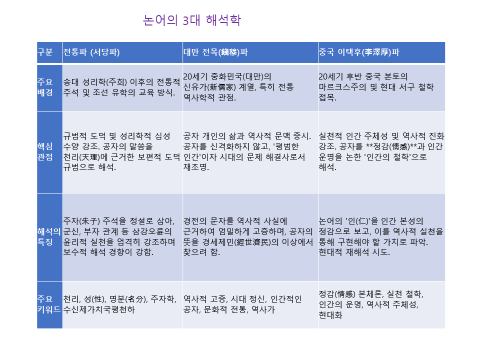 * 전통파의 대표적인 인물로는 주희가 있으며, 그의 주석은 유교 경전 해석의 기준으로 여겨집니다. 전통파는 유교의 도덕적, 윤리적 가르침을 강조하며, 사회적 질서와 개인의 도덕적 수양을 중요시합니다.