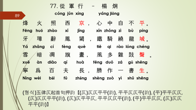 3.근체시(近體詩) • 정의: 근체시는 당나라 시대에 완성된 정형시로, 고체시와는 달리 엄격한 형식적 규칙을 따릅니다. 근체시는 주로 율시(律詩)와 절구(絶句)로 나뉘며, 각 형식은 특정한 자수와 구수, 압운 규칙을 가지고 있습니다. • 형식: 근체시는 일반적으로 5언(五言)과 7언(七言)으로 구성되며, 각 구는 일정한 평측법(平仄法)을 따라야 합니다. 이는 시의 리듬과 운율을 엄격하게 규제합니다. • 주요 특징: o 각 구의 길이와 구성 방식이 정해져 있어, 문학적 표현이 고도로 정형화되어 있습니다. o 대구(對句)와 같은 구법이 존재하여, 시의 구조가 더욱 복잡하고 세련됩니다. o 근체시는 고체시와 악부시에 비해 문학적 규범이 엄격하여, 시인의 창작에 있어 더 많은 제약이 있습니다.
