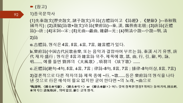 결론 고체시, 악부시, 근체시는 각각의 역사적 배경과 문학적 특성에 따라 구분됩니다. 고체시는 자유로운 형식과 민속적 요소를 강조하며, 악부시는 음악적 요소와 민간적 주제를 중심으로 한 시가입니다. 반면, 근체시는 엄격한 형식적 규칙을 따르는 정형시로, 문학적 표현이 고도로 정제되어 있습니다. 이러한 차이는 각 시 형식이 발전해온 역사적 맥락과 문화적 배경에서 기인합니다.