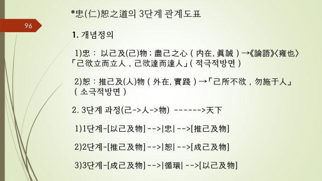 8) 忠恕 -《左傳》文公元年「忠,德之正也」 《中庸》13章「忠恕違道不遠。施諸己而不願,亦勿施于人」 鄭顥, 《二程遺書》第11卷「以己及物, 仁也., 推己及物, 恕也」 《朱子集註》「盡己之心以待人謂之忠,推己之心以及人謂之恕」 焦循(淸, 玩元 제자), 《論語通釋》「忠恕者何? 成己以及物也」