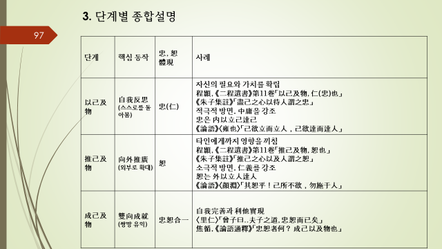 이상의 내용을 정리하면 忠은 恕의 적극적인 방면이고, 盡心曰忠,盡忠而敬, 心守中正, 中庸을 강조. 恕는 소극적인 방면이고 心如人意, 仁義를 강조. 즉 忠은 内以立己達己;恕는 外以立人達人이고, 《論語》를 인용해서 말하면, 〈顏淵〉「其恕乎!己所不欲,勿施于人」이고, 〈雍也〉「己欲立而立人,己欲達而達人」이라고 할 수 있다. ;