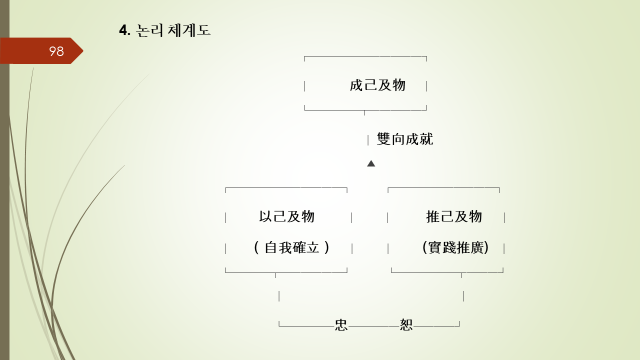 즉 忠은 内以立己達己;恕는 外以立人達人이고, 《論語》를 인용해서 말하면, (충은 내부적으로 자기를 세워 다른 사람을 통달하게 하고) (서는 외부적으로 다른 사람을 세워 줌으로서 다른 사람을 통달하게 하는 것이다.)