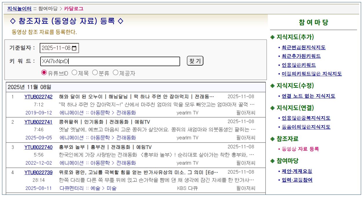 1. 메뉴 이동 : 지식놀이터 > 참여마당으로 이동합니다. 2. 기존 자료 조회: 현재 등록된 "참조 자료(유튜브)" 목록을 확인할 수 있습니다. 3. 등록 화면 진입: - '키워드' 입력란에 확보한 유튜브 ID (1단계의 ①)를 입력합니다. - "찾기" 버튼을 클릭하면, 해당 ID에 대한 새로운 등록 화면으로 자동 전환됩니다.
