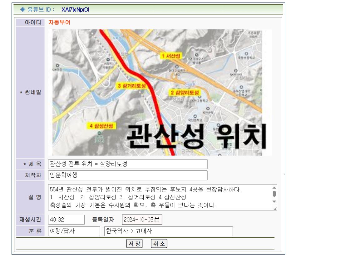 3.1) 썸네일 - 영상의 대표 이미지가 정상적으로 출력되는지 확인합니다. - 시스템에서 자동으로 추출됩니다. 3.2) 제목 - 영상의 제목이 자동으로 추출됩니다. - 특수문자나 그림문자로 인해 부정확할 경우 수동으로 수정합니다. 3.3) 저작자 - 영상 업로더(채널명)가 자동으로 추출됩니다. 3.4) 설명 – 1단계의 ④에서 준비한 요약 내용을 입력합니다. - 최대 3줄 내외로 간결하게 작성하는 것을 권장합니다. 3.5) 재생시간 - 1단계의 ② 정보를 정확한 형식에 맞춰 입력합니다. - (예: 01:25:30) 3.6) 등록일자 - 1단계의 ③ 정보를 정확하게 입력합니다. 3.7) 분류 - 이 영상이 속하는 대분류/소분류를 지정합니다. - 기존에 등록된 유사 자료의 정보를 참고하여 분류의 일관성을 유지합니다.