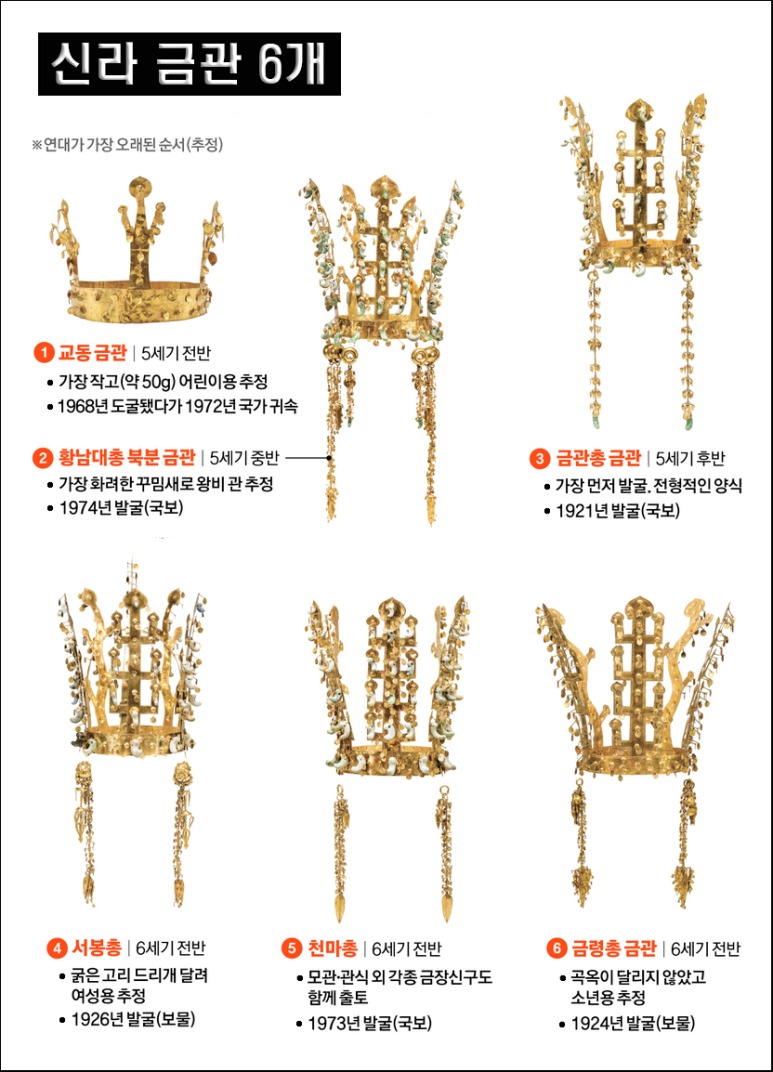 4. 제작 시기(추정) 금관이 만들어진 시기는 5세기 ~6세기 전반으로 드라마에서 선덕여왕이 금관을 쓴 것은 잘못된 것으로 왜냐면 선덕여왕은 7세기 인물이기 때문입니다. 제작 순서는 ①교동 금관 ②황남대총 북분 금관 ③금관총 ④서봉총 ⑤천마총 ⑥금령총 순입니다. 금관의 주인공이 누구인지 아직 밝혀지지 않고 있습니다.