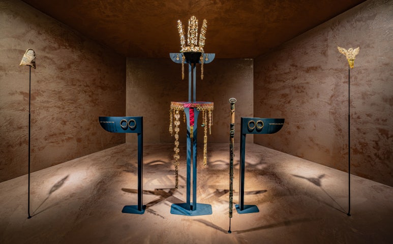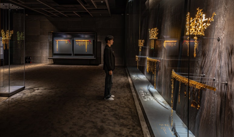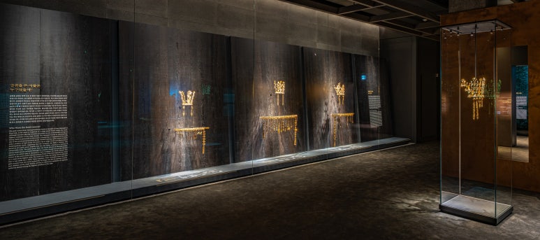 7. 전시품 금관, 금 허리띠와 드리개, 금제 관모, 금제 관모 꾸미개, 봉황 장식 고리 자루 큰 칼, 금 팔찌 등으로 전시되어 있습니다.