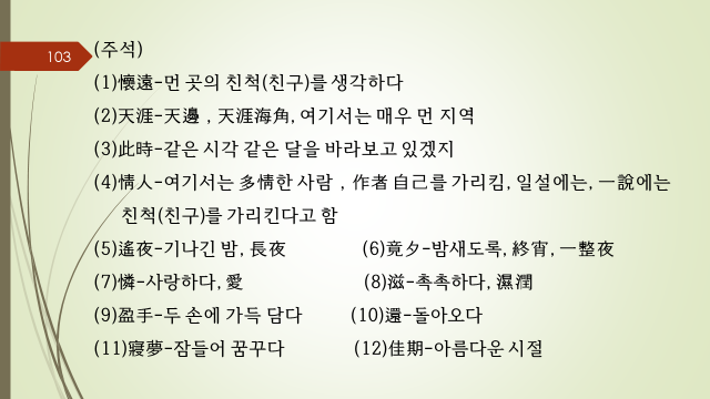 1. 당시제목 : 망월회원 2. 작자 : 장구령(張九齡)( 678~740) 당나라의 시인 장구령은 당나라 현종(玄宗) 시대의 마지막 명재상 (名宰相)으로 불리는 정치가이자, 당나라 시의 전성기인 성당(盛唐) 시기를 대표하는 시인 중 한 명입니다. 그는 뛰어난 문학적 재능뿐만 아니라, 강직한 성품과 선견지명을 가진 인물로 역사에 기록되어 있습니다.
