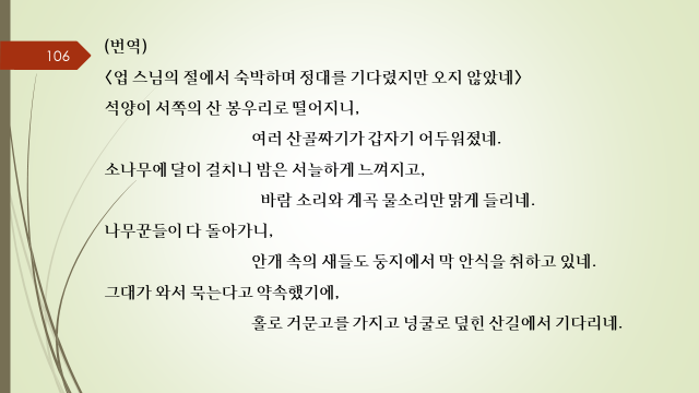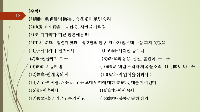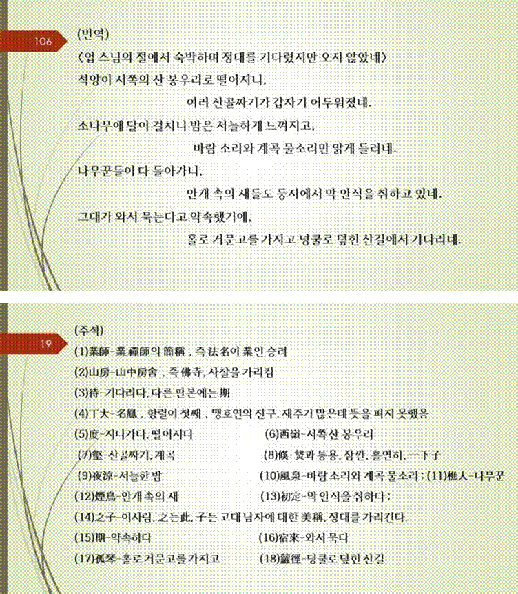 1. 당시제목 : 업 스님의 절에서 숙박하며 정대를 기다렸지만 오지 않았네 2. 작자 : 맹호연(孟浩然)( 689~740)