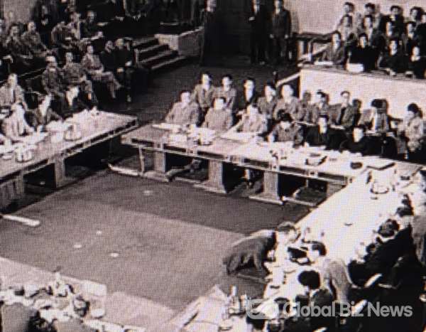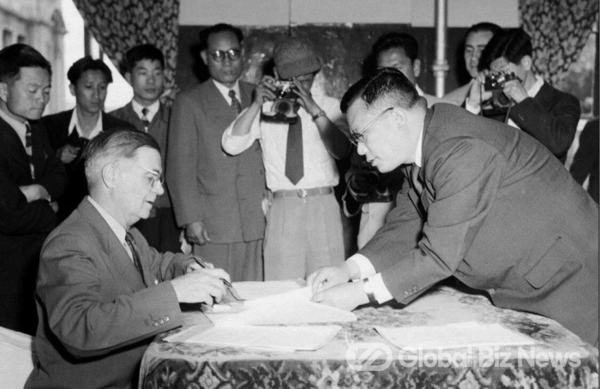 1953년 운크라 원조 조인식(콜터 UNKRA 단장과 백두진 국무총리)(사진:국가기록원)