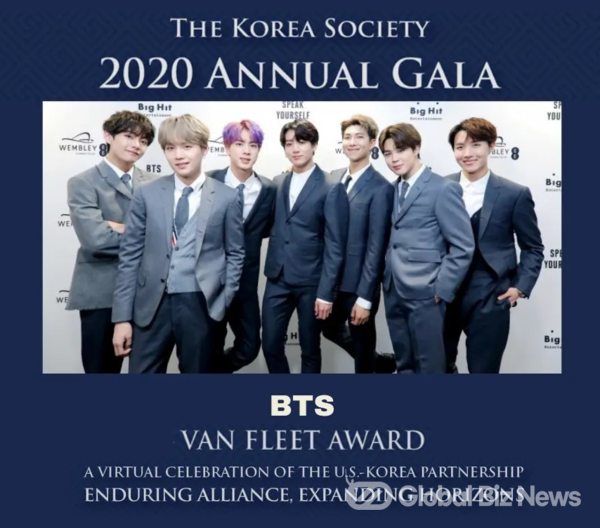 2020년 10월 7일 BTS(방탄소년단, 김남준(RM), 김석진(진), 민윤기(SUGA), 정호석(제이홉), 박지민, 김태형(V), 전정국)가 코리아 소사이어티어로부터 밴 플리트 상을 수상했다. 김남준은 “글로벌 커뮤니티의 일원으로서 우리는 함께 더 행복해지기 위해 더 깊은 이해와 연대를 구축해야 합니다.”라고 스피치를 하였다.