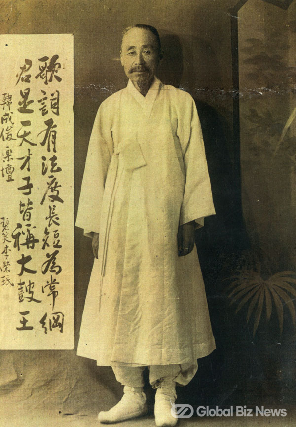 한성준은 한성 부민관에서 ‘한성준 무용공연회’ 공연을 마친 후 순천 출신 국악 후원자 벽소(碧笑) 이영민(李榮珉, 1882~1964)이 쓴 시 옆에서 사진을 촬영했다.
