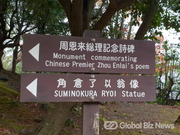 일본에서 周恩來 총리를 좋아하는 사람들이 고인을 추모하며 1979년 중·일 우호의 상징으로 시비를 건립하였다. 시비 제작에 참여한 단체들의 면모를 흩어보고 앞면의 있는 시를 천천히 읽었다. 21살 周恩來 유학생은 아랴시야마의 풍광을 보고 시를 남겼다. 시의 내용은 “소슬비 내리고 안개 짙은데, 구름 뚫고 비친 한 줄기 빛 볼수록 더욱 아름답고 곱네! 세상 모든 진리는 좇을수록 알기 어려워도 우연히 본 한 점의 광명, 참으로 아름답도다!”라고 풀이했다. 시비 주변의 심어진 나무와 아름다운 풍경을 감상하며 한동안 바장였다.