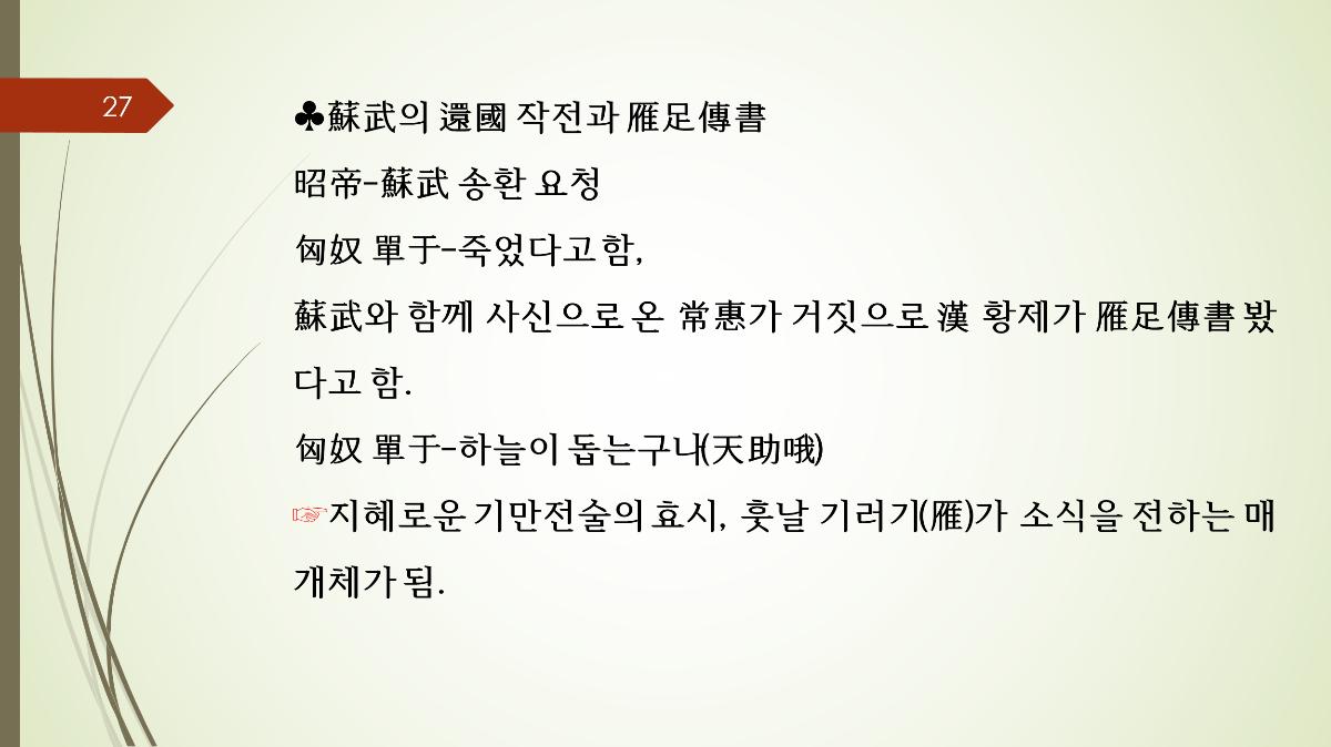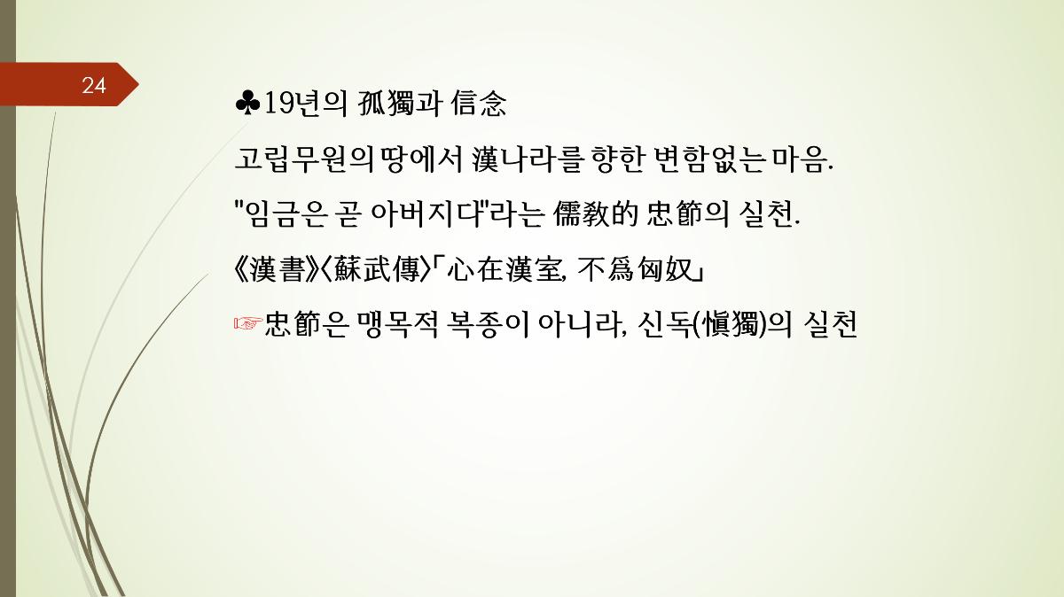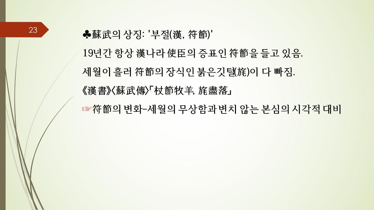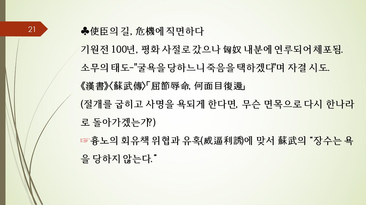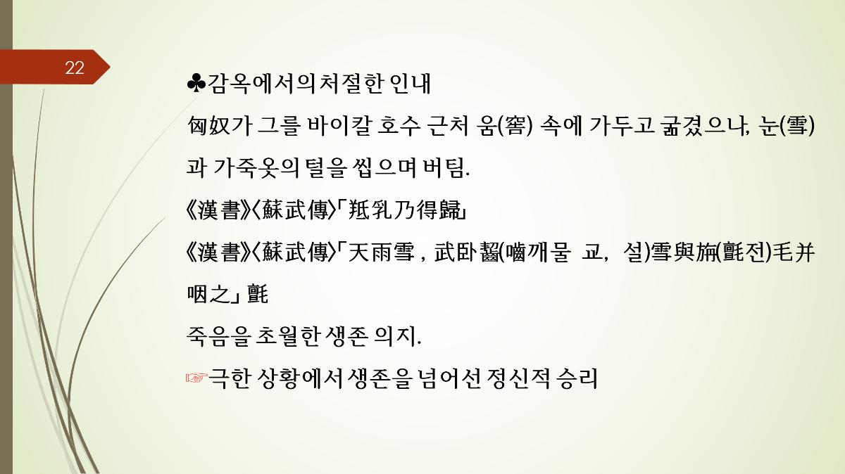 《漢書》〈蘇武傳〉「單于使衛律召武受辭。武謂惠等:“屈節辱命,雖生,何面目以歸漢!”引佩刀自刺。衛律驚,自抱持武,馳召醫。鑿地爲坎,置煴火,覆武其上,蹈其背以出血。武氣絶,半日復息。 惠等哭,輿歸营。單于壯其節,朝夕遣人候問武,而收系張勝。」 (이 대목은 흉노에 사신으로 갔다가 절개를 지키기 위해 자결을 시도한 소무(蘇武)의 강인한 기개와 그를 살려 내려는 긴박한 상황을 묘사하고 있습니다.)