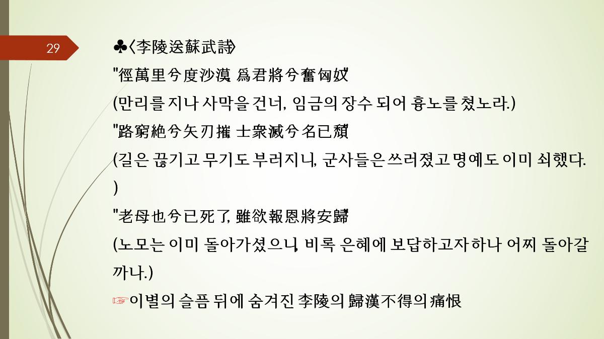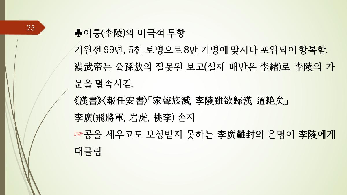 * 사마천의 『사기(史記)』 〈이장군열전〉에 기록된 이광(李廣) 장군 가문의 비극적인 역사는 중국 역사상 가장 안타까운 충신 가문의 사례로 꼽힙니다. 이광의 아들 이당호(李當戶)와 손자 이릉(李陵)에 대해 정리합니다.